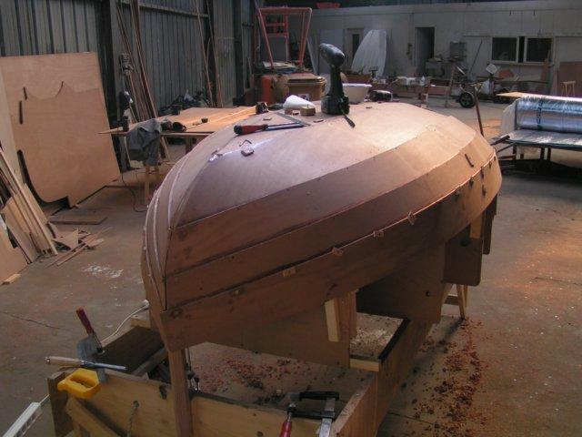 Les vis temporaires tiennent le joint en attendant la prise de la colle (époxy chargée.) Les vis traversent les 2 bordés et "prennent" dans un écrou en CP marine à l'intérieur. Comme elles se chargent en époxy au montage, il est impératif de les enlever avant la prise complète de l'époxy, sinon elles deviennent solidaires du joint et on les casse en forçant. | ![]() |