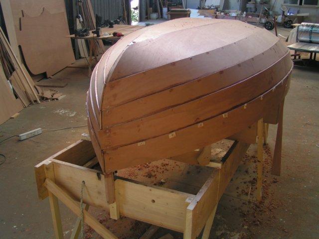 Une partie des trous de vis temporaires est déjà bouchée. Il faut encore créer un plat sur l'étrave pour rapporter l'étrave externe en lamellé-collé. | ![]() |