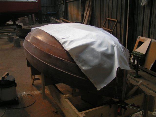 Le tissu de verre est coupé à la dimension pour couvrir la sole et les galbords. Le rôle de cette stratification est de protéger la partie de la coque qui sera la plus exposée. | ![]() |
