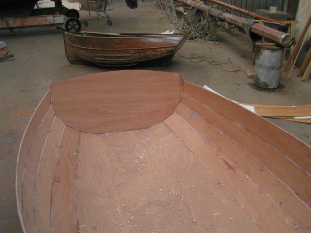 Ce grattage est un grand moment de plaisir : le dos cassé en 2 pour atteindre les joints intérieurs, avec ciseau ou grattoir et la trouille de démolir le pli de surface du CP... Le tableau arrière est coupé en arc de cercle, reste à arrondir les angles (j'ai réussi à la placer !) Le "canote" que l'on distingue à l'arrière-plan est en construction bois traditionnelle, par Gilles Conrath. | ![]() |