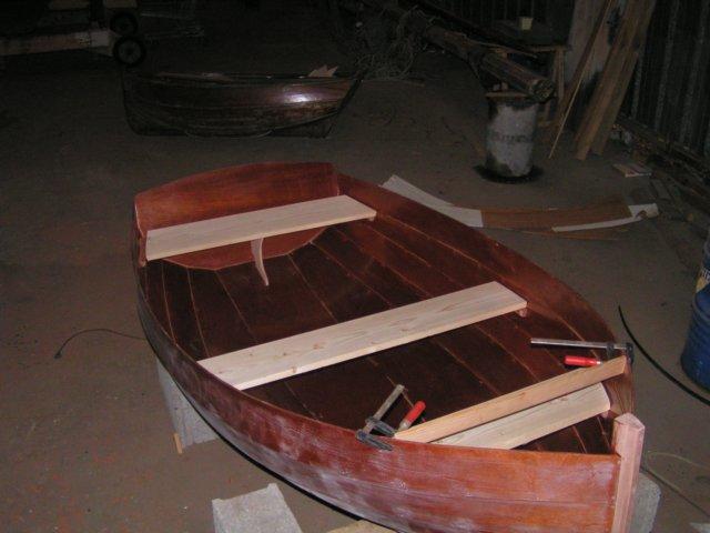 On aperçoit une traverse temporaire qui maintient l'ouverture à l'étrave, en attendant les serres, et l'épontille du banc arrière. | ![]() |