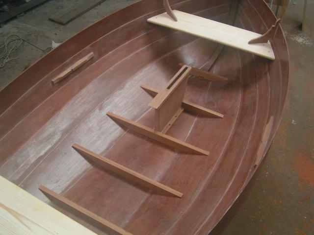 La varangue avant est entaillée "à cheval" sur le marsoin. Il reste à percer les anguillers, qui permettront à l'eau embarquée de circuler librement pour être écopée plus facilement. | ![]() |