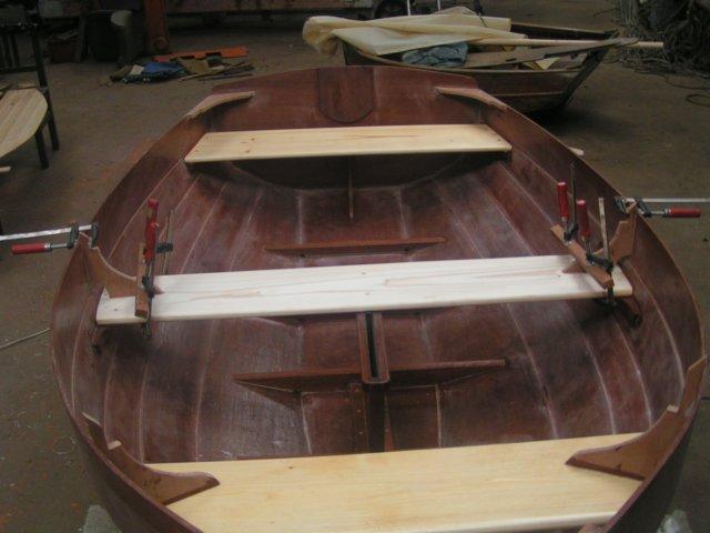 Le banc est fixé en trois points : les tasseaux sur les 2 bordés et le haut du puits de dérive, qu'il fixe latéralement. | ![]() |
