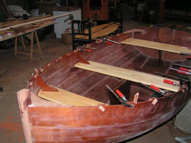 L'emplacement des blocs de support de serre résulte d'un calcul quasiment alchimique qui permet de répartir la distribution de l'effort sur le bordé. Les bancs et leurs courbes ont reçu leur imprégnation d'époxy. | ![]() |
