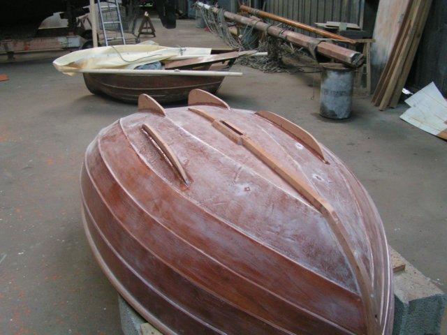 Les quilles d'échouage sont venues compléter les skegs jumeaux et la quille centrale. Il reste à poser les bandes molles en inox ou aluminium. On aperçoit dans l'étrave, à droite en bas de l'image, la fente qui permet de "noyer" partiellement le piton d'étrave afin qu'il soit moins exposé. | ![]() |