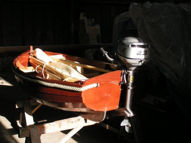 Essai de positionnement du moteur. Pas de problème, bien qu'à mon sens, ce moteur soit un peu lourd pour cette coque. Il vaudrait sans doute mieux installer un moteur électrique (ou pas de moteur, car Arwen se manie superbement à l'aviron.) A suivre... | ![]() |