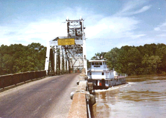 Le pousseur est bloqué par le pont, et le courant le fait venir en travers. | ![]() |