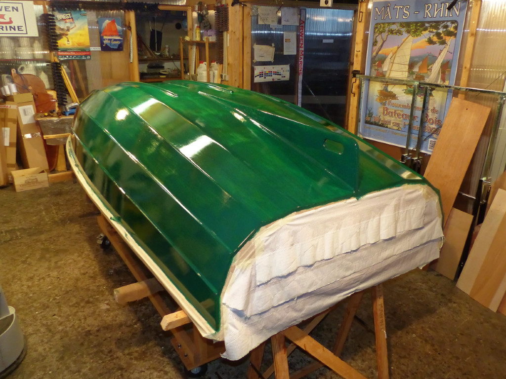Après un dernier ponçage et dépoussiérage complet, je masque (bretzel liquide, comme aime à le dire le Concombre Masqué !) et je passe la première couche de peinture "vert brume de jade". |
