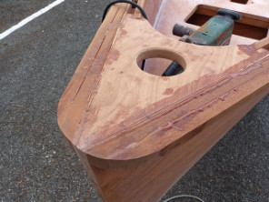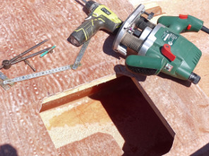 Le lendemain du collage des sièges, j'ouvre les emplacements des trappes à la défonceuse, sur laquelle j'ai monté une fraise droite à copier. Je commence par percer un trou de 10 mm à la perceuse afin d'introduire la fraise, puis je viens appuyer le guide (le roulement se trouvant au bas de la fraise) sur le tasseau le plus proche et je découpe ainsi l'ouverture en ne serrant pas trop les angles, que je veux arrondir selon le tracé fait préalablement au compas. |