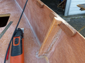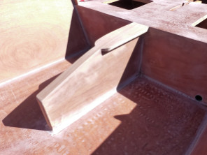 Avant de coller les listons, j'ai passé une couche d'époxy sur le couvercle de l'arrière du puits de dérive ainsi que sur les supports des sièges latéraux, que je viens de coller. |