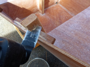 Suite de la construction du Goat Island Skiff (GIS) de Jacques : j'ai collé la structure de renfort des ouvertures des trappes. |