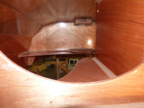 Après application des trois couches réglementaires, je retourne à nouveau la coque afin de faire le vernis sur l'intérieur, les listons, le tableau et la marotte. |